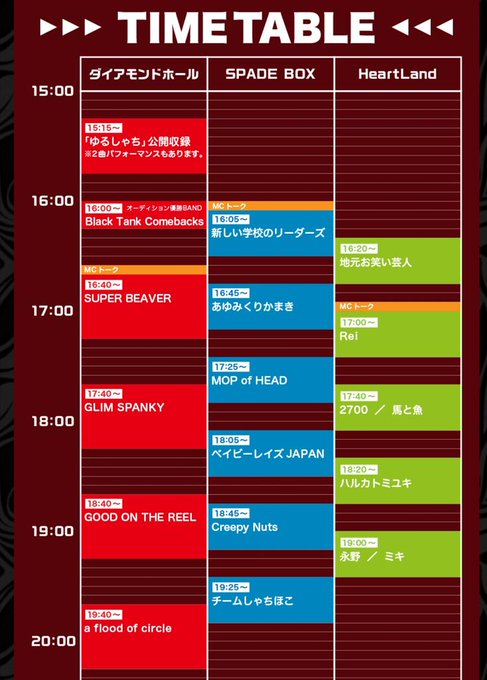 コレサワ→mihoro*→川嶋志乃舞→にゃんぞぬデシ→あーた→ヒグチアイ→つるうちはな そしてー✴ 最後はー✴ つるうちはな❗ gee-ge.で21:10からだよ❗ 最後はgee-ge.に集合❕ #ハグロック pic.twitter.com/JjljJDMYOw