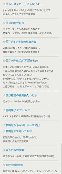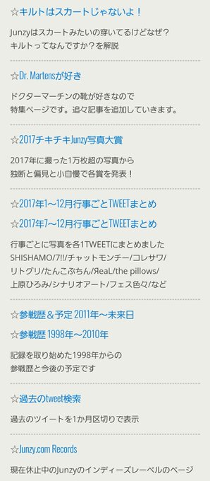 HP更新しました🆙 junzy.com ・キルトはスカートじゃないよ! ・Dr.Martensが好き ・2017チキチキJunzy写真大賞 ・2017年行事ごとTWEETまとめ ・僕が雑誌の編集長だったら ・宮崎朝子『カブトムシ』 ・吉川美冴貴インカレ📷🆕 ・ライブ参戦歴&予定一覧 ・過去のtweet検索 pic.twitter.com/CVmEPXKJ9h